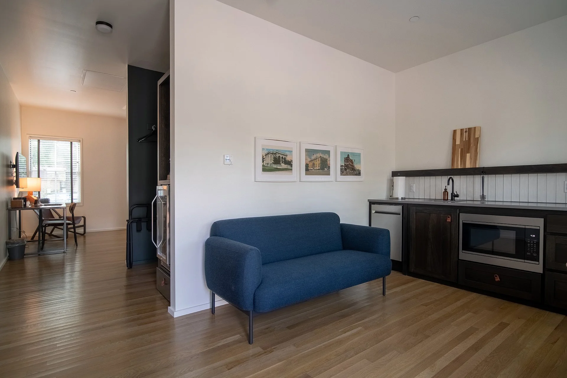 A spacious kitchenette suite with a king bed, a desk, a sofa, and high ceilings. Kitchenette includes a dishwasher, mini-fridge, and microwave.